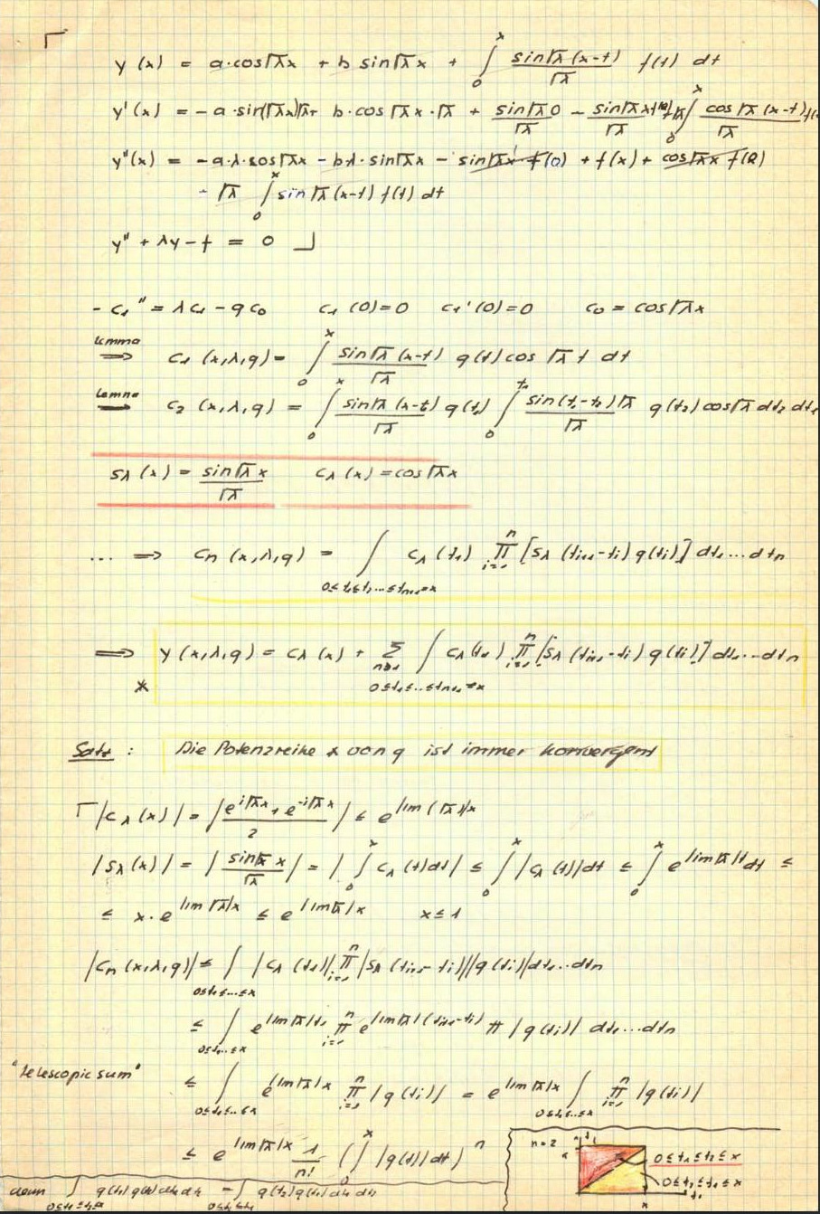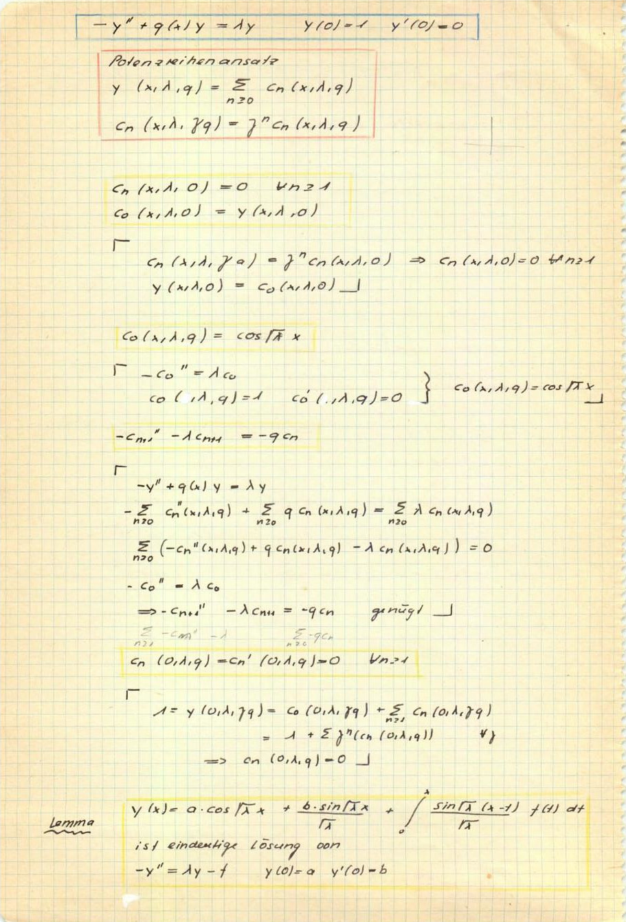 The picture to the right shows Eugene Trubowitz during an Analysis 3 lecture in 1983, where he covered Sturm-Liouville problems. I took it with my Minox camera as a student. Below are two pages from my notes from these lectures. The board in the middle third of the second page. I wrote about my undergraduate experience on this page. Our Analysis III class was Trubowitz’s first at ETHZ (he arrived in 1983) and he still learned German and walked around in the lecture hall with big mountain boots (he after all had arrived in Switzerland now …). His lectures were brilliant, original and felt like a wind of fresh air. He did what he liked and Sturm-Liouville problems were of course one of his specialities. To the right is a picture from 1984 (source). Here is an example computation showing the above statement Af=g.