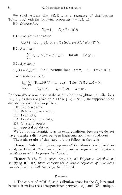 In mathematics, Osterwalder is most obviously linked with the Osterwalder-Schrader axioms from 1972, while he as a postdoc at Harvard. It is an axiom system for Wightman distributions. The choice of distributions is a kind of interesting philosophically and is a case where the difference between “geometries” and “fields” is huge. Distributions are the dual of smooth functions. There is an other intereresting point in that Euclidean quantum field theory can be analytically continued into a Lorentzian case. The point of the approach was to work with Euclidean Schwinger functions and then show that this can be carried over to a Minkowski quantum field theory. It appears however that for realistic 4 dimensional field theories, one just has no interesting example. This triviality conundrum is what I understand to be part of the mass gap problem which Sudan talked about last December. I don’t know much about this part of mathematical physics but it seems that the problem is just too difficult and that different approaches are needed.